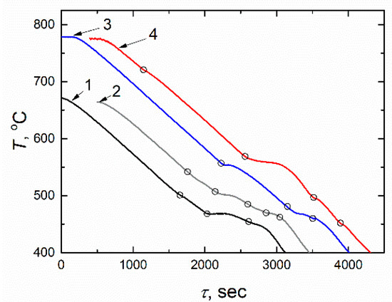 Temperature versus time during cooling of FLiNaK with different NdF3 contents (mol.%): 1—6, 2—15, 3—20, 4—30.