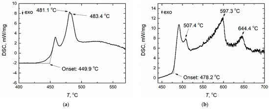 The DSC heating curves obtained (a) in the FLiNaK + 6 mol% NdF3; (b) in the FLiNaK + 26 mol% NdF3 (b).