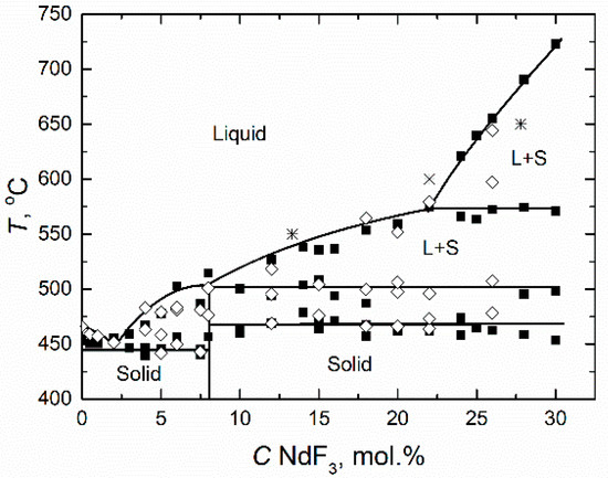 Phase diagram of the FLiNaK-NdF3 system: ■—TA by cooling curves; ◊—DSC; *—data [14].