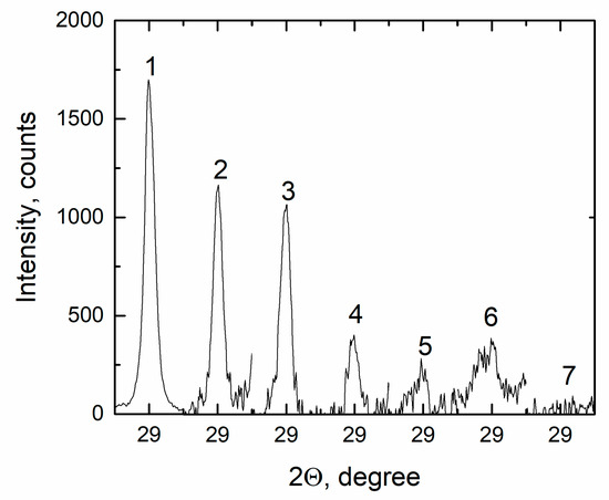 Intensity of the reflection orthorhombic phase for (1) FLiNaK + 0.5 mol.% NdF3; (2) FLiNaK + 1.0 mol.% NdF3; (3) FLiNaK + 2.0 mol.% NdF3; (4) FLiNaK + 3.0 mol.% NdF3; (5) FLiNaK + 4.0 mol.% NdF3; (6) FLiNaK + 5.0 mol.% NdF3; (7) FLiNaK + 7.5 mol.% NdF3.