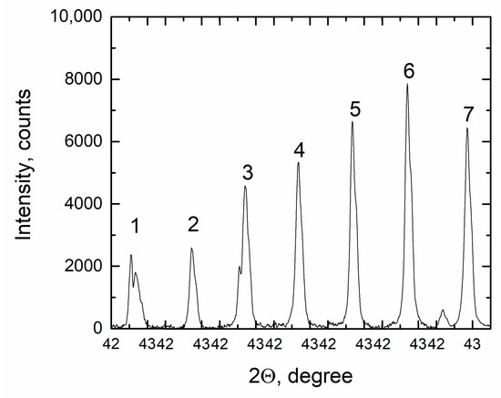 Intensity of the reflection (111) of the KF phase (1) FLiNaK; (2) FLiNaK + 0.5 mol.% NdF3; (3) FLiNaK + 1.0 mol.% NdF3; (4) FLiNaK + 2.0 mol.% NdF3; (5) FLiNaK + 3.0 mol.% NdF3; (6) FLiNaK + 4.0 mol.% NdF3; (7) FLiNaK + 5.0 mol.% NdF3.