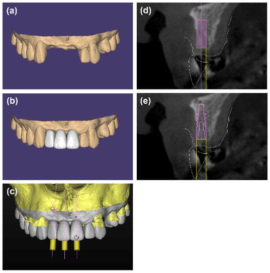 (a–d) 3.5 mm diameter and 10 mm-length virtual implants were placed in a prosthetically ideal position under the guidance of the diagnostic wax-up. (e) The 3.5 mm diameter and 10 mm-length virtual implants were replaced with specific virtual implants of the proper size to fabricate the surgical guide plate for implant placement.