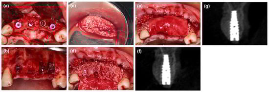 (a,b) The labial defect could be observed. (c) Particulate bone substitutes were mixed with i-PRF to form i-PRF blocks. (d,e) The i-PRF block was placed into the bone defect and covered with a collagen membrane, and titanium pins were used to fixate the membrane. (f) Radiographic cone-beam CT view immediately after wound closure. (g) Radiographic cone-beam CT view at 6 months.