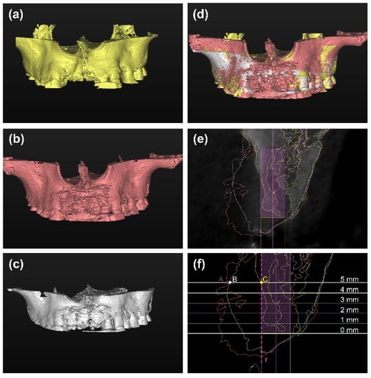 Based on the concept of prosthetic-guided regeneration, the predesigned virtual implants in the “baseline.spr” were used as a reference for radiographic evaluation. The DICOM files of the postoperative CBCT scans at T1 and T2 were converted to STL files, respectively, using Simplant software and superimposed on the preoperative CBCT in the “baseline.spr”, while anatomical structures (such as anterior nasal spine and posterior nasal spine) were used for superimposition. The superimposition of CBCT at T0–T2 was following the method proposed by Jiang et al. [25].
