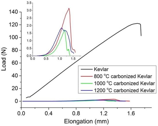 Finally, when mechanical properties were investigated, the single yarn strength of Kevlar was found to reduce heavily after the carbonization (Figure 4). The maximum reduction in yarn strength was observed in the case of 1200 °C carbonized Kevlar fabric, where breaking force decreased from 127 N to 2 N and breaking elongation decreased from 1.79% to 0.94%. This behavior was attributed to the formation of additional pores or rough surfaces on Kevlar fibers after the carbonization (see Figure 5).