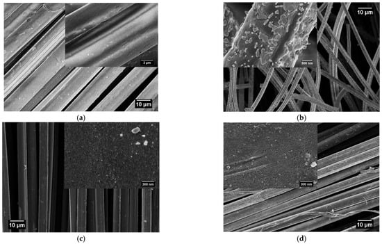 Microstructure of Kevlar fibers after different carbonization temperatures. (a) Kevlar fabric; (b) activated carbon fabric at 800 °C; (c) activated carbon fabric at 1000 °C; and (d) activated carbon fabric at 1200 °C.