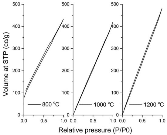 BET analysis. The absorption of electromagnetic radiations depends on the specific surface area of materials; therefore, the BET analysis was performed on samples of Kevlar derived carbon obtained at 800 °C, 1000 °C, and 1200 °C carbonization temperatures. From the nitrogen adsorption/desorption isotherm of activated carbon fabrics shown in Figure 6, a rapid rise in the adsorption–desorption isotherm can be observed. This confirmed the type I isotherm based on the classification of the International Union of Pure and Applied Chemistry (IUPAC) [34,35] and the formation of micropore in carbonized Kevlar fabrics. Moreover, the constant slope at intermediate relative pressures with increasing carbonization temperatures indicated the presence of uniform micropore sizes [13]. More clear observation of the isotherm indicated some contribution of type IV with a type H4 hysteresis loop. With an increase in carbonization temperature, the type H4 hysteresis loop was found to become narrow. This indicated a negligible effect of an increase in carbonization temperature on the development of mesoporosity in the structure [36,37]. The marginal increase in specific surface area with an increase in carbonization temperature was observed. The specific surface area for activated carbon fabric prepared at 1200 °C, 1000 °C, and 800 °C obtained was 248 m2/g, 174 m2/g, and 109 m2/g, respectively. This behavior was attributed to the opening of previously inaccessible pores through the removal of tars and disorganized carbon by the gradual reaction of atmospheric oxygen with carbonized Kevlar fibrous waste [38]. Nevertheless, the smaller values of maximum surface areas compared to literature can be associated to possible collapse or closure of pores by a gasification-induced densification at higher carbonization temperature [24].