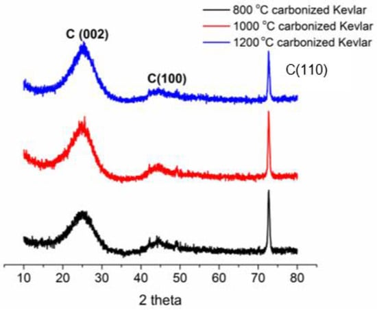 Table 1 shows the effect of carbonization temperature on physical characteristics of Kevlar derived activated carbon fabrics. The yarn count, areal density, and thickness of Kevlar fabrics were found to drop by more than 50% after the carbonization at 1200 °C. During the carbonization, the main chemical transformation occurred, involving the formation of intermediate aryl nitriles at 500–600 °C, and then progressive aromatization/ring condensation, leading to polyaromatic compounds above 600 °C. This resulted in isotropic, non-graphitizable carbon fibers at first and then into activated carbon by activation with oxidizing natural gas [33]. The yield of activated carbon reduced with an increase in carbonization temperature, and 31% yield was obtained after 1200 °C carbonization. These results are in agreement with previous studies [15,22].