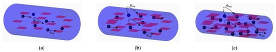 Mechanism of charge transport. The movement of electrons through one graphite layer or their hopping across the defects/interfaces between disordered graphite layers can be attributed to the development of electrical conductivity in activated carbon samples [41,42,43]. Therefore, the two potential means of electron transport (migration and hopping) in the activated carbon fabric produced at 800, 1000, and 1200 °C, respectively are shown in Figure 8a–c. The migration and hopping of electrons were responsible for the higher electrical conductivity of the 1200 °C activated carbon fabric than the 800 and 1000 °C activated carbon. This was possible due to a higher graphite content, uniform distribution of graphite layers, and reduced fiber diameter, which finally resulted in the formation of a more compact micro-current network in the 1200 °C activated carbon fabric [44,45].