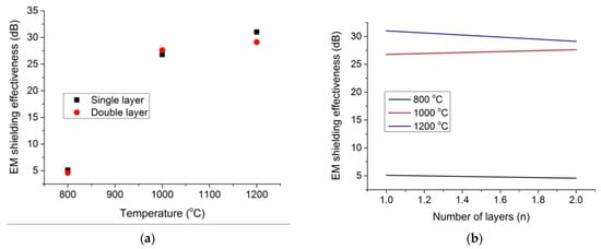 Electromagnetic shielding effectiveness at 2.45 GHz; (a) effect of carbonization temperature; and (b) effect of number of layers.