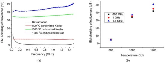 Coaxial transmission line method. This method was employed to estimate the electromagnetic shielding effectiveness of activated carbon samples in frequencies of 600 MHz, 1 GHz, and 1.5 GHz. From Figure 10a,b, it can be seen that the shielding effectiveness increased with increase in the carbonization temperature. The lowest electromagnetic shielding effectiveness, of about 5 dB, was observed for the single layer of activated carbon fabrics produced at 800 °C. However, when the Kevlar fabric was carbonized at 1200 °C, the shielding ability of 42 dB, 45 dB, and 51 dB was found for respective frequencies of 600 MHz, 1 GHz, and 1.5 GHz. As discussed in the previous section, the similar reasons for the fiber arrangement and gasification-induced densification effect can be attributed to overall lower values of electromagnetic shielding for Kevlar derived activated carbon fabrics than the acrylic derived activated carbon nonwoven web in previous work [24].