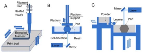 Three-dimensional printing schematics for (A) fused deposition modeling, (B) stereolithography, and (C) selective laser sintering that are representative of extrusion, resin, and powder processes, respectively. Reprinted with permission from Ref [42] Copyright 2020 by the authors and license MDPI, Basel, Switzerland.