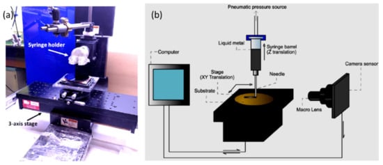 (a) Digital photograph exhibiting the custom print stage for direct printing of liquid metal contacts (left) and (b) a diagram to explain the 3D printing operation. Reprinted with permission from ref. [47] Copyright (2018) American Chemical Society.