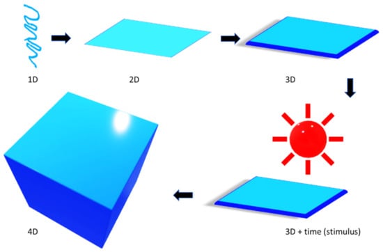 As the Figure 5 suggests, 4D printing can be envisioned as an advanced printing method where a 3D printed structure alters itself (as shown in Figure 5 with light activation) into a different object with the effect of external energy input, such as heat, light or other available environmental stimuli [49,50,51,52]. Four-dimensional printing is programmed to alter a 3D printed structure, in terms of its shape, property, and functionality [53,54,55,56,57,58]. It is endowed with properties, such as self-assembly, self-repairability, and multifunctionality. It is time-dependent and foreseeable, but independent of the selection of ingredients and choice of the printer. Such an evolutionary characteristic depends mainly on the choice of appropriate smart functional materials in the 3D space. There are at least two stable conditions in a 4D printed objects, and the structure can change from one state to another under the influence of appropriate stimulus. Four-dimensional printing demonstrates several benefits over 3D printing in quite a few aspects [59].