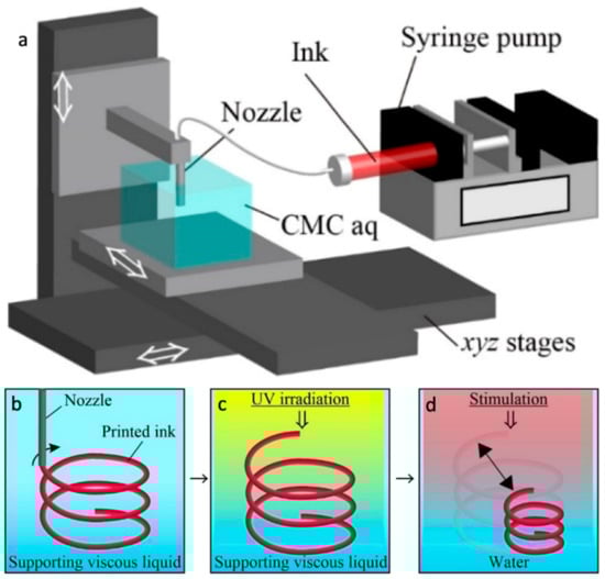 (a) Schematic diagram of a 4DP system. It is showing that a nozzle is secured on a z stage, and a vessel of carboxymethyl cellulose aq (CMC aq) is secured on xy stages. By stirring the xyz stages, the pre-gel ink is deposited through the nozzle into CMC aq using a syringe pump. Concept for printing 4D object with internal gaps. (b) Pre-gel monomer ink is deposited into auxiliary viscous liquid to print a 3D ink design. (c) The written ink is subjected to UV light and is polymerized to acquire a 3D hydrogel assembly. (d) Afterward substituting the auxiliary liquid into water, the polymerized 3D hydrogel assembly collapses in reaction to UV light. Reprinted with permission from reference [61], Copyright 2020 by the authors and license MDPI, Basel, Switzerland.