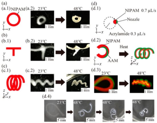 A validation of a 4D printing process. (a) Schematic presentation of printed structures and heated structures with a rounded pattern. (b) Schematic presentation and images of a printed T-shaped structure and a heated T-shaped structure with a cross point. (c) Schematic presentation of a printed spring structure and heated spring structure with an internal gap. (d) Schematic presentation of printing a C-shaped structure with multihydrogels (d.1) and its 3D shape changing from the C-shaped structure to the spring-shaped structure. (d.2) Fluorescence images of the fabricated C-shaped structure (d.3) and the transformed spring structure obtained by heating. (d.4) Time-lapse images of the C-shaped structure. Reprinted with permission from reference [61], Copyright 2020 by the authors and license MDPI, Basel, Switzerland.