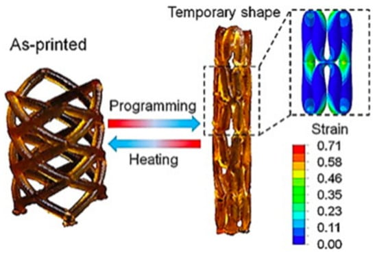 Three-dimensional printing is a precursor to the fabrication of multimaterial 4D structures, especially with a simple geometry. Typically, a 4D printed structure is shaped by combining several materials into a one-time printed single structure [62]. The variances in material properties, such as thermal expansion coefficient, swelling ratio, modulus etc. led to the anticipated shape-changing effects. A suitable stimulus is also essential to activate the property/shape/functionality variations in the printed object. The selection of the stimulus hinge on the demands of the specific application and the stimuli that have been used in 4D printing thus far consist of heat, light, water, or a combination of the three [63,64,65,66,67,68,69]. Smart or stimulus-responsive material is the other most critical component of 4D printing. The ability of these materials is well-defined by material properties: multifunctional, smart decision making, self-sensing, sensitivity, shape memory, self-adaptability, and self-repair [70,71,72]. A demonstration of a 4DP method is shown in Figure 7 where variations of 4D structures were fabricated to demonstrate the effectiveness of the method. The proposed method allows the printing of complex 4D multi-hydrogel structures with cross points and internal gaps. Figure 8 describes a thermo-responsive, shape memory polymer (SMP)-based, 4D-printed cardiovascular stent, fabricated by Ge et al. [73]. Stents, being vital biomedical devices to enlarge the human vessels, have been at the center of many research studies [74,75].