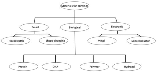 The available materials that can be printed using advanced manufacturing techniques have turned out to be more diverse owing to an advancement in printing knowledge and machineries. These materials can be categorized into three broad areas, such as electronic, biological, and smart materials. The typical used materials include metal, polymer, proteins, DNA, nanowires, and nanotubes. The classification of the printable materials, based on their applications, is shown in Figure 9. Table 3 summarizes these printing materials along with the respective printing strategies and potential applications for an informal comparison.