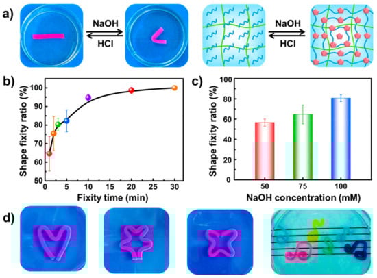 (a) The shape memory performance and mechanism founded on chitosan physical microcrystalline crosslink. (b) Change in the shape fixity ratios of the PAAm-CS hydrogels as a function of the fixity time in NaOH solution (75 mM). (c) Change in the shape fixity ratios as a function of concentration of NaOH solution with a shape fixity time of 1 min. (d) Pictures of the more complex transient shapes of PAAm-CS hydrogel secured by NaOH (75 mM). Reprinted with permission from reference [84], Copyright 2017 by the authors and license MDPI, Basel, Switzerland.