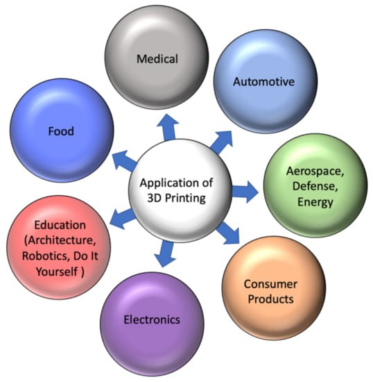 With improving properties and new AM techniques coming up lately, it has become possible to take the 3D printing manufacturing approach to its next level. Three-dimensional printing technology has been useful in various and varied areas. Figure 12 shows the various kinds of usages of 3D printing which also comprise applications in research and development, visual aids, presentation models, artistic items, device covers, custom parts, functional models, and patterns together with series production. Injection molding 3DP has also become the most used manufacturing process for the automated fabrication of plastic moldings. By applying this advanced printing, plastic parts with complex geometries are being manufactured quickly and cost-efficiently without any significant amount of postprocessing. Prototyping of different components in aerospace industries has always been the key to developing new lightweight products, which is why 3D printing of late has made sufficient inroads into this industry. In addition, 3DP offers possibilities of waste reduction and emissions in the aerospace industry. AM has been primarily used in military applications so far. However, it would be highly beneficial to deploy this technology in the arena of the commercial aerospace industry.