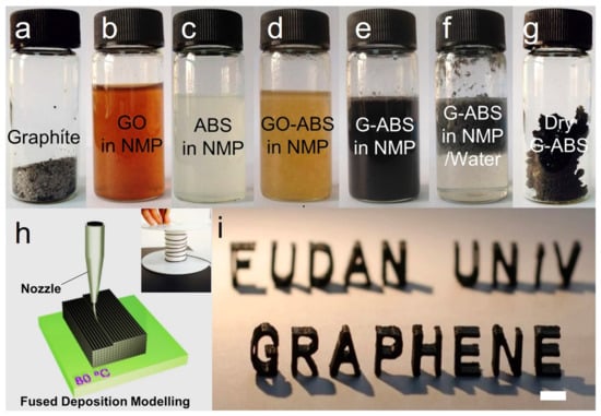 Photograph of (a) graphite flakes; (b,c) dispersions of graphene oxide(GO) and ABS in N-methylpyrolidone (NMP) solvent; (d,e) a homogeneous mixture of GO-ABS in NMP before and after chemical reduction; (f) graphene(G)-ABS clots found after isolation (e) with water; (g) G-ABS composite powder after washing and drying; (h) schematic illustration of fused deposition modeling 3DP, the inset shows the graphene-based filament winding on a roller; (i) a typical 3D printed model consuming 3.8 wt% G-ABS composite filament, scale bar: 1 cm. Reprinted with permission from reference [104], Copyright 2015, Nature.
