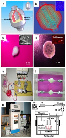 Three-dimensional printing also holds the potential to unscramble limitations in existing biomedical industries. It can be expanded to rapidly manufacture personalized tissue engineering scaffolds, in situ restoration of damaged tissues within cells, and even straightway print tissue and organs. Recently, Wang et al. [105] have reported, a hybrid hierarchical polyurethane (PU)–cell/hydrogel construct that was automatically shaped exploiting an extrusion-based double-nozzle and low-temperature 3D printer (Figure 14a–g).