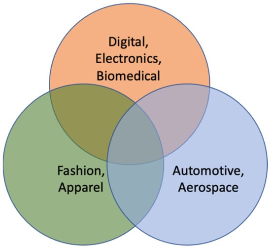 As has already been explained, 4D printing, being an upcoming advanced version of the existing 3DP technology, is well poised to help accelerate growth in many research and industrial sectors. Some of the potential sectors include aerospace, engineering, automobiles, energy, manufacturing, defense, medicine and various other fields. Four-dimensional printing offers better reliability, improved consistency, and superior performance characteristics over 3D printing. Initial types of 4D printers contain versatile 3D structures pre-printed via 3D printing and that can be transformed to other sizes and shapes when immersed in water or exposed to light, pressure, gravity, or air [107]. Figure 15 summarizes the important roles of 4D printing in the field of manufacturing, as applicable to different industrial sectors. Although 4D printing has been in the manufacturing market over the last few years, its supply chain, with faster shipping and lower storage space options offer definite advantages. Four-dimensional printing removes a large degree of transportation and processing expenses, thus providing the supply chain with incredible applications [108,109].