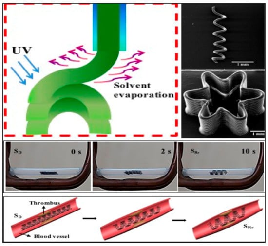 Very encouraging applications of 4D printing in the field of medicine have been reported. One such example is the 4D printing of intravascular stents. The entire research work has been captured in a diagrammatic representation (Figure 18) where the printing process, along with the bending in the presence of a magnetic field, and intravascular stent application has been explored. Four-dimensional printing is offering benefits to both doctors and researchers, alike, particularly in areas not obscured by the 3D printing technologies. This printing technology can deliver extensive support in the biomedical field, especially with better and smart biomedical implants, tools, sensors, actuators, and devices. It is hoped that the medical practitioners will be able to navigate 4DP technology to serve their patients better.