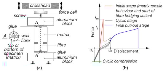 Double-sided, single fibre pull-out test: (a) testing setup [8]; (b) applied cyclic loading regime [9].