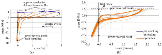 Additionally, Müller and Mechtcherine performed load-controlled, cyclic uniaxial tension and tension-compression tests [7,16]. For this purpose, a loading regime was applied as shown in Figure 4b. Unlike the samples in the deformation-controlled tests, the specimens were pre-damaged until a deformation of 250 µm was reached before the cyclic loading with a frequency of 5 Hz was started. The lower reversal points were set to either 0.1 MPa in the case of pure cyclic tension tests or −8.0 MPa for alternating cyclic loading [16]. For the upper reversal point, the authors chose between two options. Either the individual first crack stress of each single specimen or an average first crack stress was defined as the reference level for the upper reversal point. On this basis, three different upper stress levels related to first crack stress were specified: 40%, 60% and 80%. In addition to deformation-controlled cyclic loading tests, Jun and Mechtcherine [15] also investigated the load-controlled uniaxial tension regime. After reaching a strain of 0.5% the specimens were cyclically loaded at a frequency of 0.5 Hz.