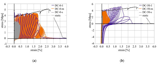 Representative stress-strain curves measured in deformation-controlled cyclic tests compared to a typical quasi-static test: (a) pure tension; (b) alternating tension-compression with lower reversal point at 50% of the compressive strength.