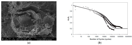 The change from a pure tension-swelling regime to alternating tension-compression loading leads to a further damage mechanism in the composite. The investigations by Müller and Mechtcherine [7,14,16] showed that the repeated compression loading causes the development of microcracks and therefore the loosening of the microstructure; see Figure 8.