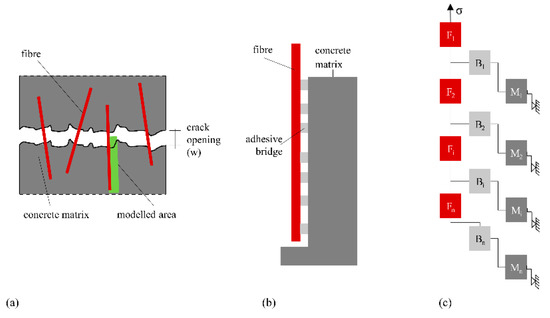 In this section, a rheological modelling approach is suggested. The basis of this modelling is an individual fibre connected to the concrete matrix via bonding bridges. Both the fibre and the matrix entities as well as the bonding bridges are described by a composition of different basic rheological elements in accordance with [32]. The basic setup of this modelling approach is shown in Figure 12. For modelling the fibre is divided in several sections, 1 to n, while between neighbouring sections an adhesive bridge is placed linking the fibre to the matrix. This bonding bridge can be interpreted as an interphase between fibre and matrix, for example, similar as it forms in the bond zone between aggregate particles and binder matrix. For ordinary concrete such an interphase is usually specified with a thickness of 10 to 50 µm [41]. Investigations of similar cement-based matrices reinforced with PE fibres produced this interphase zone, which, compared to the rest of the matrix, had a significantly looser structure and a thickness of 15 to 30 µm, depending on the type of fibre [42]. In comparison to such an interphase, the concrete matrix appears as a solid, self-contained block. However, this solid block can also be loosened by the cyclic compressive load, resulting in little individual matrix blocks that can only interact with the remaining matrix through frictional forces.