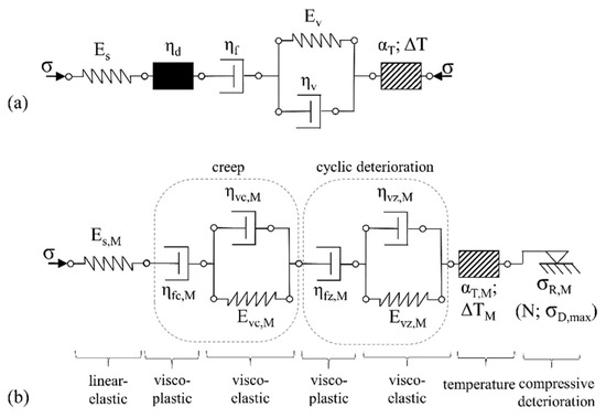 Complex material behaviour can be described by a suitable combination of these elements, all of which represent specific features of the material and its damage mechanisms. Such descriptions for the material behaviour of concrete have been suggested by Burgers, and separately Duda [28], among others. A cyclic supplement to existing rheological concrete models has been proposed by Kessler-Kramer [29] and von der Haar [30] for discussion.