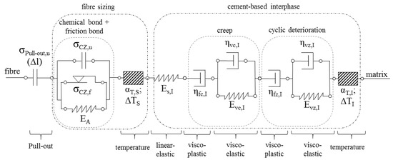 The present model is relatively complex, so that its mathematical description cannot be included in this publication due to the inordinate number of formulas and the numerous assumptions to be presented. While not all parameters needed for subsequent calculation are known at this stage, it seems still to be helpful to apply the model using sensibly made assumptions. The calculation results generated in this way for the fibre pull-out under cyclic loading offer the possibility of estimating the effect of individual parameters’ changes on the overall response of the system. This work is to be presented in a follow-up publication. The results of the presented physically based rheological model can be transferred to the material’s representative volume such as tensile test specimen by means of modelling approaches similar to those suggested by Barhum [32] or Jun and Mechtcherine [17] when sufficient test results are available.