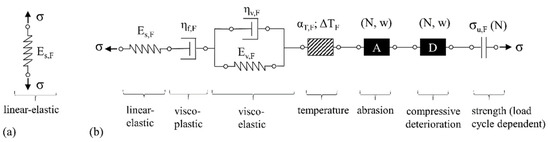 By assuming that these damage types follow the superposition principle, i.e., a summation of the strain components, the phenomena described were added to the model by a serial connection; see Figure 16b.