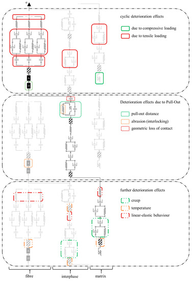 All model adjustments suggested are shown in Figure 18. The respective final arrangement of element groups is analogous to the basic idea presented in Figure 12, a row of element groups for fibre, interphase and matrix with specific connections between the groups. The fibre is divided into several sections. Between two neighbouring fibre sections is positioned one interphase entity, which is always connected to a matrix element. For the sake of readability, only three sections of a fibre as well as the corresponding interphase/contact zone and matrix sections are shown. Furthermore, one force path is highlighted. In addition, various exposures are displayed, and the corresponding reaction and possible damage location are highlighted.
