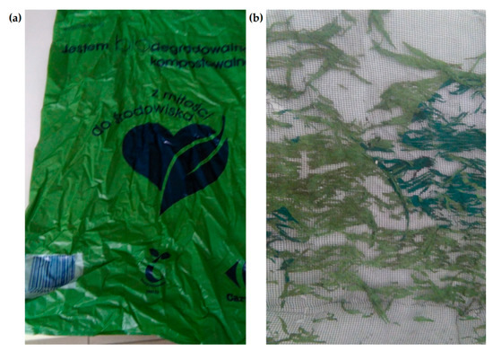 Plastic materials are widely used in many industries due to their strength, environmental resistance and flexibility. The growing demand for plastics poses the problem of the increasing amount of waste from plastics at the end of their service life [1]. The characteristics of plastics that used to be an advantage, at the end of their service life are the source of decomposition problems [2]. The solution to this problem may be materials made of biodegradable and oxo-biodegradable plastics [3]. Biodegradable materials should decompose under the influence of macro- and microorganisms. Oxo-biodegradable plastics are also biodegradable, but initiating biodegradation requires “abiotic degradation”, e.g., through the use of heat energy or UV radiation [4,5]. Oxo-biodegradable plastics contain additives that are responsible for the initiation of decomposition (prooxidants). The most common additives on the market are d2w® (biodegradable plastic technology) or TDPA® (Totally Degradable Plastic Additives). The rate of biodegradation is influenced by many factors, e.g., chemical character of the polymer, environmental conditions, microbial population activity [6,7]. According to the manufacturers’ assumptions [8,9,10], biodegradable plastics must fulfil designated functions, that is, be (for example) durable and flexible, and at the same time, at the end of their service life, they should be biodegradable in the environment, i.e., in litter, landfill, compost or soil.