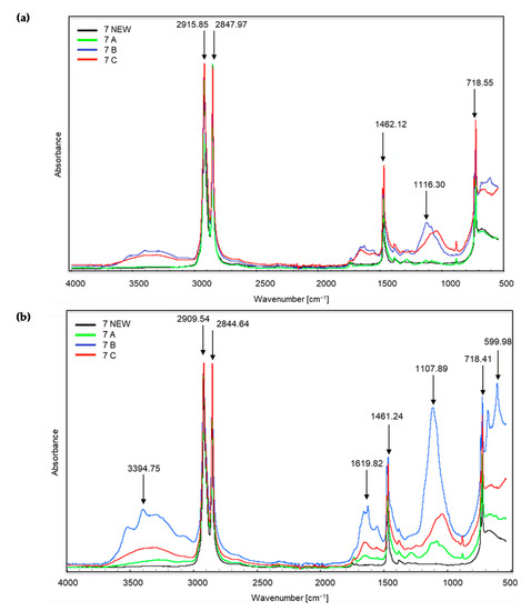 In the case of sample no. 7 (Figure 4), the first significant changes appeared already in the range of wave numbers amounting to approximately 3394 cm−1, which proves the occurrence of stretching vibrations of the amino group N–H. These changes are most intense for the coloured part of sample B, i.e., irradiated for 20 h and then composted. One can also see very intense peaks at approximately 2915, 2909, 2844 and 2847 cm−1, which correspond to the vibrations of the C–H methylene group. Initially, C–H stretching occurs, followed by bond cleavage. This applies to all the samples, including the new ones. Both in the white and coloured parts of the material, peaks in this range are the most intense for trial C, i.e., irradiated for 50 h and then composted. Further changes occur in the spectra of coloured materials at the wave numbers of approximately 1619 cm−1, which corresponds to the appearance of bending vibrations of the N–H amino group. The peaks at wave numbers around 1461 and 1462 cm−1 (for white and coloured material) are the reappearance of C–H bonds (bending vibrations). The next changes concern the wave numbers in the range from approximately 1116 and 1107 cm−1 and confirm the appearance of C–O oxygen groups of carboxylic and ester bonds. The bands at approximately 718 cm−1 are C–Cl stretching vibrations. Finally, in the coloured part of sample no. 7B, a very intense band appears at a wave number of approximately 599 cm−1. According to the authors of the tables [39,40] these are stretching vibrations of C–Br bonds, alkyl halides, which are very stable compounds. The presented changes can be related to the visual assessment. After the composting process, we observed clear changes in the coloured part of sample no. 7. The sample material was also less flexible.