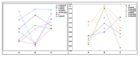The use of hierarchical cluster analysis (supplementary materials, Figure S6) confirmed the existence of similar relationships between the spectra of the tested samples. Samples that were completely decomposed during composting (1, 2, 3, 11) ended up in the first main cluster (A), along with the color part of sample no. 6. According to the manufacturer’s declaration, 85% of it was made from sugar cane and there were signs of a biodegradation process. Samples 1, 2, 3 and 11 could be made of materials containing similar components. The remaining samples were included in the second cluster (B). It includes all the samples that were not decomposed in the composting process (except for the coloured part of sample no. 6). This cluster is divided into two smaller ones: the first one (B′) is dominated by coloured parts of samples (4, 10, 5, 8) and samples of uniform colour (9 and 12). It also includes the white parts of samples 4 and 5. Most of the mentioned samples showed an increase in the CI value after 20 h irradiation compared to the samples composted without irradiation. The second cluster (B″) has the most white samples (6, 8, 7, 10), and the coloured part of sample number 7 belongs to this.