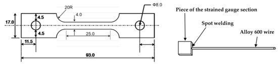 To evaluate the effect of tensile stress on the electrochemical properties of the oxide layers, specimens with 30% tensile engineering strain were prepared by tensile testing of specimens with a gauge length and width of 25 mm and 4 mm, respectively, in air to the preset engineering strain level. The strained gauge sections were cut to have a surface area of approximately 1 cm2 along the gauge length. Each specimen was spot-welded to an Alloy 600 lead wire. These specimens were used as a working electrode for electrochemical measurements after immersion corrosion tests or for polarization tests as they were. The dimensions and preparations of the specimens are shown in Figure 2.