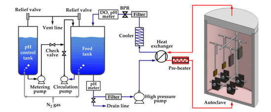 The immersion corrosion test was performed to form oxides on specimens with two types of stresses (stress-free and tensile stress) and on specimens with two tensile strain levels (0% and 30%) in simulated secondary water of a PWR. Figure 3 schematically shows the water-circulating system used for the test. The test solution was fed into a 316 stainless-steel autoclave by a high-pressure pump via a preheater, and the effluent was cooled-down and returned to a solution tank via a cooler, a dissolved oxygen (DO) meter, and a pH meter. Specimens were placed on specimen holders made of Alloy 600 to avoid galvanic corrosion effect in the autoclave. The test solution was prepared by adjusting the pH of deionized water to 9.0 at 25 °C with ethanolamine, which is a typical pH control agent for secondary water of PWRs. The dissolved oxygen level was controlled below 5 µg/L by continuously blowing high-purity nitrogen gas (99.999%) into the feed tank at a flow rate of 50 cm3/min. The temperature of flowing water adjacent to the corrosion specimens was consistently maintained at 340 °C, and the system pressure was controlled at 170 bars using a back pressure regulator (BPR). The duration of the test was 1000 h.