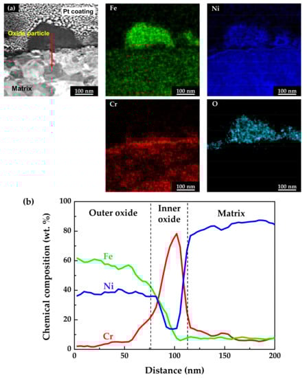 The chemical compositions of the oxidized specimens were analyzed using scanning TEM (STEM) and EDS. TEM foils were prepared from the cross-sections of the specimens using the FIB technique. Figure 5 shows the STEM micrographs and EDS analysis results of the stress-free specimen. As shown in Figure 5a, the EDS elemental mapping images revealed that the outer particles were oxides composed mainly of iron and nickel, with a minor amount of chromium. In addition, a chromium-enriched, thin oxide layer was observed not only on the surface adjacent to the matrix, but also beneath the oxide particles. The chemical compositions of the above oxide layers were measured using EDS line profiling along the red arrow direction denoted in the STEM image. The obtained results were then normalized to obtain the weight percent of the major alloy elements (nickel, chromium, and iron). As shown in Figure 5b, the outer oxide particles were determined to have a chemical composition similar to nickel ferrite, NiFe2O4. The EDS line profiles also clearly revealed that the chromium-enriched inner layer was formed beneath the outer oxide particles. Chromium up to approximately 80 wt.% was detected in the inner layer. Note that the chromium content of the matrix was 15 wt.%, as shown in Table 1. In summary, the oxide films consisted of double layers with an iron- and nickel-rich outer layer and a chromium-rich inner layer. Therefore, the chemical compositions of the oxide layers indicate that the chromium-rich inner layer was formed through preferential dissolution of iron and nickel, and that the dissolved iron and nickel ions were precipitated to form the iron- and nickel-rich oxide particles on the outer surface.