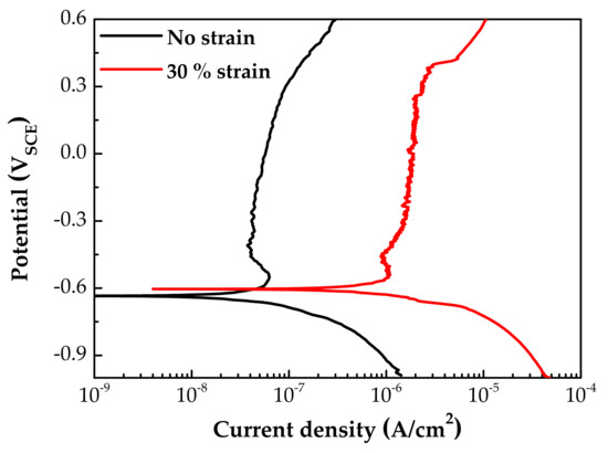 Potentiodynamic polarization tests were performed using fresh specimens with different strains (0% and 30%) that were not exposed to the immersion corrosion condition. The solution for the polarization tests had the same solution chemistry as that used in the immersion test. The solution temperature was maintained at 80 °C using a heating mantle. Cathodic preconditioning was done at −0.5 V versus the OCP for 3 min after the potential reached the stable OCP. After that, polarization scans were run from −0.4 V to +1.6 V versus the OCP at a scan rate of 0.5 mV/s. The corrosion current densities (icorr) of the test materials were calculated using the Tafel extrapolation method from cathodic polarization curves.
