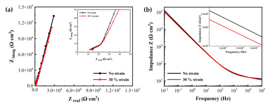 Figure 7 shows the potentiodynamic polarization curves of specimens with and without 30% tensile strain. The corrosion potentials (Ecorr) were little affected by the strain. However, both the anodic and the cathodic polarization current densities of the strained specimen were significantly increased by the plastic tensile strain. In particular, the corrosion current density at Ecorr and anodic current densities above the Ecorr were 20–30 times greater than those of the stress-free specimen. It is believed that the above changes in particle size and chemical composition of oxides, as well as polarization current, are closely related to the electrochemical property of the oxides. Therefore, the EIS and capacitance behavior of oxide films were analyzed, as described below.