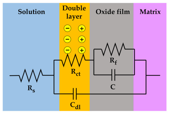 The measured EIS data were analyzed in more detail by fitting them to the electrical equivalent circuit shown in Figure 9, where Rs is the resistance of the test solution, Rct is the charge transfer resistance of the Faraday processes, Cdl is the capacitance of the electric double layer, Rf is the resistance of the oxide films, and C is the capacitance of the oxide films. The circuit model was constructed to simulate the electrochemical impedance behavior at the solution/oxide film interface and inside the oxide films. The EIS data were fitted using the Gamry Electrochem Analyst software. The electrochemical impedance parameters obtained for the equivalent circuit are listed in Table 2. The charge transfer resistance and film resistance decreased by approximately 20% and 30%, respectively, when the oxide films were grown on the 30% strained specimen. During the corrosion process, metal cations migrate toward the solution through defects in the oxide films and diffuse into the solution, while oxygen anions move from the solution toward the matrix. Therefore, this result indicates that the charge transfer reactions at the film/solution interface occurred more actively on the strained specimen than on the stress-free specimen. This is consistent with the oxide particle distribution (Figure 4) and the polarization behavior (Figure 7).