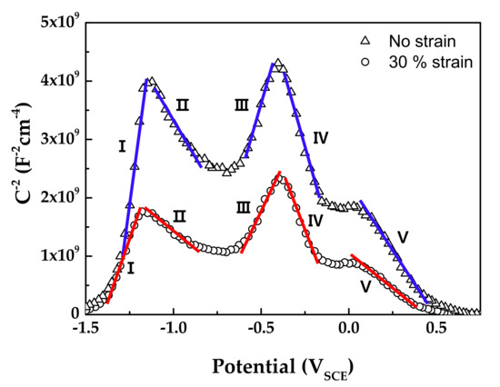Figure 10 shows the Mott–Schottky plots of oxide films formed on Alloy 600 specimens in simulated PWR secondary water at 340 °C. The capacitance values of films formed on the strained specimen were larger than those on the stress-free specimen. Because capacitance and impedance are in reverse proportion to each other, this result indicates that the film resistance of the strained specimen was smaller than that of the stress-free specimen, in agreement with the EIS data. The Mott–Schottky plots revealed that the oxide films were composed of both n-type and p-type semiconductors. Here, the positive slopes in the regions I and III represent an n-type semiconductor response, while the negative slopes in the regions II, IV, and V represent a p-type semiconductor response. Iron oxides behave as an n-type semiconductor and chromium oxides behave as a p-type semiconductor [55,56,57,58]. Therefore, the above capacitance responses reflected the double-layered oxide films with the outer ferrite-rich layer and the chromium-rich inner layer observed in Figure 5 and Figure 6. The calculated charge carrier densities are listed in Table 3. The dielectric constant of the film was assumed to be 12 [59,60]. The total charge carrier (donor for an n-type and acceptor for a p-type) densities in the oxide films of the 30% strained specimen were two times greater than those in the films of the stress-free specimen. This demonstrates that the point defects in the oxide films increased significantly when the oxide films were grown on the strained surface. The decrease in the film resistance (Table 2) can be attributed to the formation of the defective oxide films.