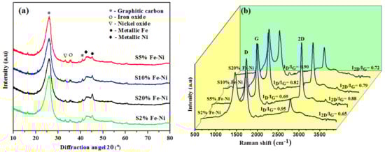 The typical XRD diffraction peaks of the porous carbon materials were catalytically graphitized at 1300 °C with different catalyst percentages (Figure 1). After graphitization for 20 min, the XRD patterns demonstrated two distinct peaks at 26° and 42.5°, which are related to the aromatic layers reflection plane of (002) and (100), respectively, and matched with the natural graphite [37]. XRD profiles also specify the microcrystalline structure of bituminous coal. The broad diffraction peak at 26° in the XRD profiles was observed in all Fe-Ni samples, from S2% to S20%, and the S5% sample had the highest intensify peak (see Figure 1a). Moreover, the synthetic graphite material had a lower intense peak at 45.2° for the Fe catalyst and 44.6° for the Ni catalyst. These results confirm that the Fe and Ni catalysts have existed in coal-based activated carbons, which is supported by the literature review [38]. The metallic Fe and Ni formed by reducing the iron oxides and nickel oxides during the graphitization period. Furthermore, the oxides and carbides of iron and nickel and the metallic Fe and Ni in the graphitized samples are beneficial for LIB applications. These oxides, such as Fe2O3 and NiO, are involved in the conversion reaction and delivered the extra sites to store the Li+ during the charging/discharging process. The metallic Fe and Ni assisted in raising the electronic conductivity [39,40,41].