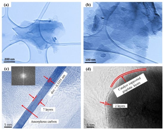 (a,b) Different magnifications of the TEM images of the S5% Fe-Ni sample; and (c,d) HRTEM images of the S5% Fe-Ni sample containing two to seven layers of graphene. The inset in (c) shows the FFT image of the corresponding HRTEM.