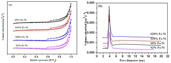 (a) N2 adsorption–desorption isotherms; and (b) Pore-size distribution curves for the different percentages of the Fe-Ni catalyst.